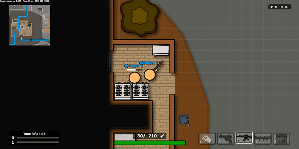 If you have a browser and a few minutes to spare, BattleDudes.io will fill them with gunfire, explosions, and the satisfying crumble of walls you just shot through. This 2D top-down multiplayer shooter, developed by Šarūnas Visockas and first released in late 2020, does not pretend to be a battle royale. There is no shrinking circle, no desperate scramble for a final safe zone. Players respawn into the same match after death, health regenerates between fights, and the pace never drops. It is closer to an old-school deathmatch than anything inspired by PUBG or Fortnite, and that identity gives the game its personality. The main hooks are simple but effective: destructible environments, drivable vehicles, and the kind of instant-play accessibility that makes .io games so appealing in the first place.