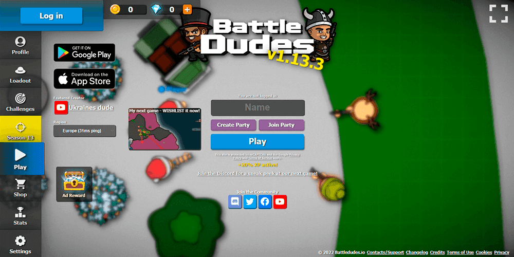 Moment to moment, BattleDudes.io plays fast and scrappy. Instead of scavenging loot from the ground, players build a loadout before spawning: a handgun, a main weapon, a secondary weapon, an item slot, and two perks. Over 20 weapons are available as you level up, and the perk system creates meaningful choices. Kevlar armor and a damage bonus let you brute-force firefights. Speed and dodge perks change how one-on-one engagements play out. Perks are also stackable, so doubling up on the same bonus is a legitimate strategy. The result is that no one stumbles onto a super-weapon or super-armor the way they might in a survival shooter. If your setup is not working, you adjust it. That keeps the playing field closer to level, even if some combinations clearly outperform others at high play.