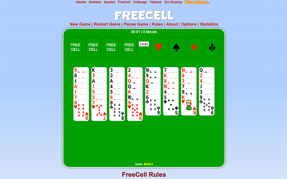 The empty slots created at the beginning of the game are the places from which the movement of cards begins. The latter is done according to certain rules: you can move a card only when to the left of it is a card of the same suit with a rank lower. For example, the Jack of Hearts can only be moved when there is a Ten of Hearts in the slot to its left.