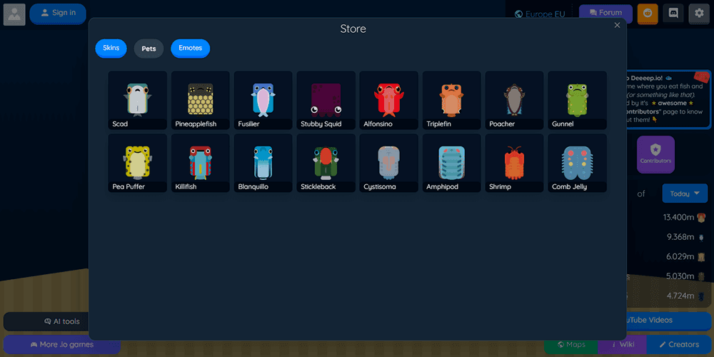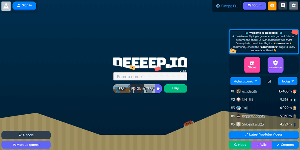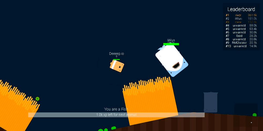 Deeeep.io is one of those free multiplayer browser games that takes a well-worn formula and finds a way to make it feel fresh. If you have ever played Agar.io or Mope.io, the basics will be immediately familiar: you start small, you eat things, you grow, and you try not to get eaten by something bigger. The twist here is that everything takes place underwater, and instead of absorbing colored dots as a featureless blob, you are working your way through an actual food chain of marine animals. That single thematic choice gives the game a surprising amount of personality. It is lightweight, accessible, and free to play in any browser, but the ocean setting and the animal-based progression system lend it more identity than you might expect from a quick lunchbreak distraction.