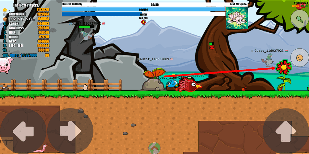 What keeps the loop readable is the green and red outline system. Prey you can eat glows green with red arrows pointing toward it, while anything dangerous is outlined in red. It is a clean visual language that prevents confusion even in crowded areas. Layered on top of the hunting is a resource management challenge: a water meter that drains as you play, forcing you to dip into water sources periodically, and an oxygen meter that punishes you for lingering underwater too long. Movement is handled with WASD or the mouse cursor, with a left click sending your creature flying a short distance. The controls are approachable enough for anyone to grasp within seconds, but as you climb through evolutions the game becomes noticeably more strategic. Choosing the right prey, timing your special ability cooldowns, and positioning yourself near resources without exposing yourself to predators all start to matter far more than raw reflexes.