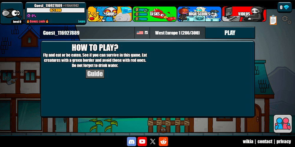 EvoWorld.io, the browser-based multiplayer survival game formerly known as FlyOrDie.io, wastes absolutely no time reminding you where you stand: at the very bottom of the food chain. The moment you press play, you're dropped into a sprawling open world as a tiny, defenseless fly surrounded by hundreds of other players who are already mid-hunt, mid-flight, and mid-evolution. The core hook is immediately clear. Eat whatever has a green outline, avoid everything marked in red, and try to survive long enough to evolve into something that can actually fight back. It sounds simple, and in a way it is. The game's free-for-all structure means there are no teams, no safe zones, and no breathing room. From the very first seconds, pressure comes from every direction. That combination of fast entry, obvious goals, and constant danger is what makes EvoWorld.io so easy to pick up and so hard to put down.