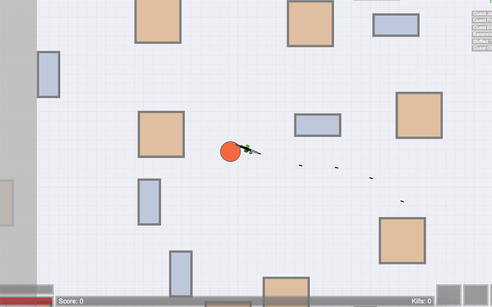 The process of controlling the character in Gats.io is similar to most shooters. WASD keys are responsible for movement, reloading is done by pressing R, and the choice of shooting direction, as well as the shooting itself, are made by means of the mouse. By pressing Spacebar, you can get access to bonuses that progress during the game.