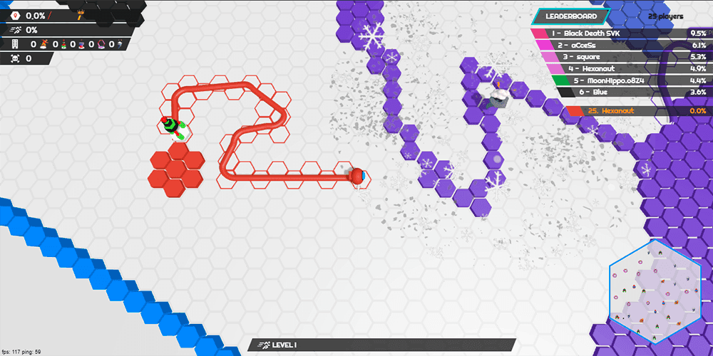 What gives matches a compelling arc is the Hexanaut objective. Capture roughly twenty percent of the map and a two-minute countdown begins. Survive and maintain that threshold, and you win the round outright. Fall below it or get eliminated, and the opportunity evaporates. This victory condition ensures that the game is never just about aimless expansion. It forces a constant negotiation between greed and caution, turning even a modest border push into a high-stakes decision.