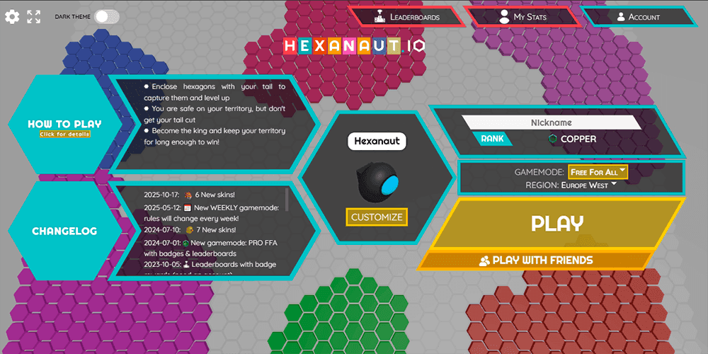 There is no shortage of browser-based territory-grab games vying for your attention, but Hexanaut.io from Exodragon Games makes a persuasive case for itself within seconds of loading. This free-to-play multiplayer title fuses classic snake-style movement with territorial conquest on a hexagonal grid, and the result is a game that is disarmingly easy to pick up yet surprisingly tense once the stakes begin to climb. No downloads, no installs, no lengthy tutorials — you open a browser tab, click play, and you are immediately steering a colored avatar across a vast honeycomb battlefield alongside dozens of other players. If you have ever enjoyed Paper.io or Splix.io but wished for a cleaner strategic focus and a more distinctive visual identity, Hexanaut.io deserves your time.