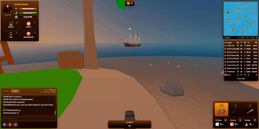 Minute-to-minute play revolves around naval combat and shared responsibility. Your character stands on a ship equipped with a cannon, and you aim and fire at enemy vessels while your captain steers. Floating crates dot the water, dropping power-ups and loot when collected. As you earn points you can upgrade three core stats — fire rate, distance, and damage — each of which meaningfully changes how your ship fights at range or up close. But the real texture comes from crews. Joining or creating a krew lets several players operate one vessel together, dividing labor between steering, shooting, and looting. Coordination through the built-in chat, which includes global, local, and clan channels, transforms chaotic skirmishes into genuine tactical engagements. When a well-organized crew locks its turning, positions its cannons, and focuses fire, smaller or solo ships rarely stand a chance. That power gap is both the game's greatest thrill and its sharpest edge; playing alone can feel punishing when a full crew bears down on you. Between battles, there is plenty to do on shore. Switching tools with the number keys gives you a fishing rod for catching crabs and fish that convert into gold, or a spyglass for scouting the horizon. Docking at islands opens a shop where you can buy new ships, items, and trade goods. A built-in trading table shows exactly which commodities to buy on one island and sell on another for profit, turning commerce into a viable path alongside piracy.