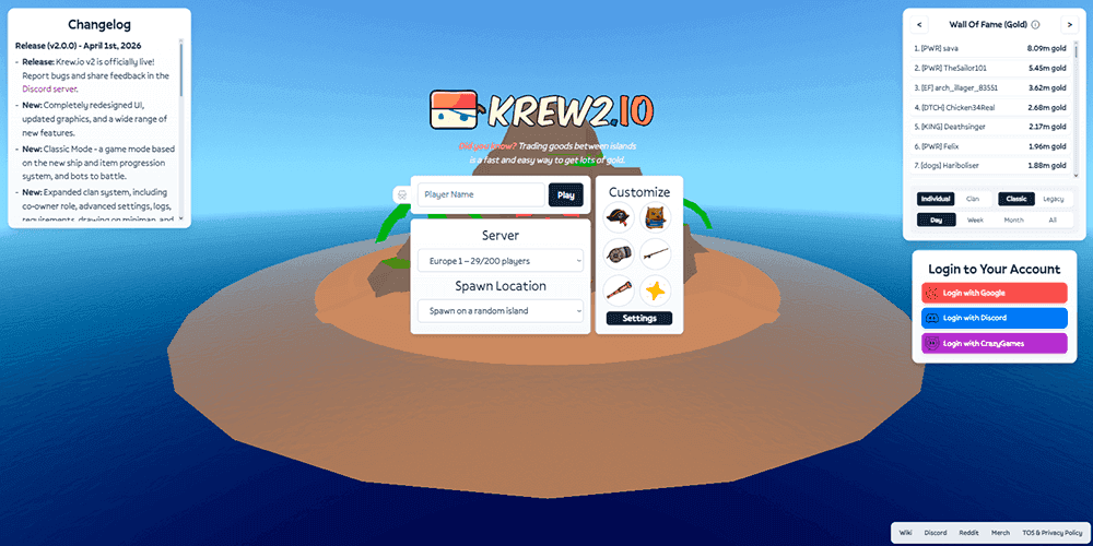 Krew.io is not the kind of game that announces itself with flashy trailers or massive marketing campaigns. It is a browser-based pirate multiplayer title that has been quietly sailing since December 2016, built in HTML5 and playable on desktop without any installation. On the surface it looks like another entry in the crowded .io arena, but it separates itself with a genuinely distinct hook: multiple players can crew the same ship. That single design choice reshapes everything. Instead of the lone-wolf survival loop that defines most games in the genre, Krew.io asks you to coordinate, communicate, and trust strangers on the open sea. The result is a 3D third-person experience that feels surprisingly layered for something you can launch in a browser tab. You sail between named islands like Spain, Cuba, Jamaica, Malaysia, and Brazil, firing cannons at rival vessels, fishing for gold, running trade goods, and chasing the top spot on the leaderboard. It is simple to start but harder to master than you might expect.