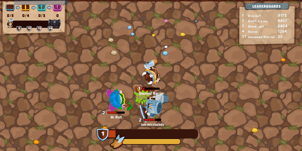 Every match in MiniGiants.io begins the same way: you are tiny, weak, and surrounded by players who would love nothing more than to squash you. The opening seconds are all about restraint. Colorful experience orbs litter the map, and gathering them is the safest route to your first few levels. Engaging other players this early is a gamble, especially against anyone visibly larger, so smart newcomers learn to scavenge and retreat before they ever learn to fight. As experience accumulates, your character physically grows, and with that growth comes a shift in battlefield presence. Suddenly you are the one chasing down smaller rivals, converting kills into rapid level gains and snowballing toward the top of the leaderboard.