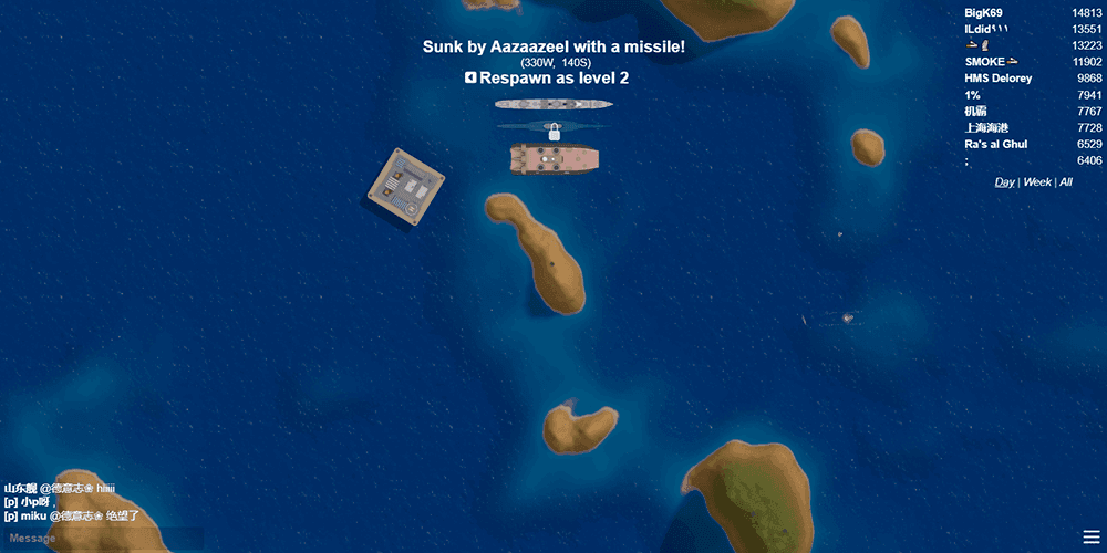 The roster is where Mk48.io flexes hardest. Forty-three ship models, each inspired by real-world warships, spread across a wild range of vessel classes. Motor torpedo boats sit at the lower tiers, armed with multiple torpedoes and the occasional gun. Corvettes and destroyers carry heavier armaments. Cruisers split the difference between nimble escorts and raw firepower. Battleships and dreadnoughts bring immensely powerful main cannons and may even carry a small complement of aircraft for anti-submarine defense. Then things get exotic. Submarines dive beneath the surface, invisible to certain attacks but forced to resurface for some weapon systems. Hovercraft glide across land and water alike. Rams exist purely to crash into enemies. Dredgers reshape the terrain itself, creating new land ahead of their path and destroying old land by sailing over it. Icebreakers plow through frozen sheets without a scratch. Aircraft carriers command squadrons that follow your cursor to strike targets. Every class changes how you think about the map, your opponents, and your own survival.