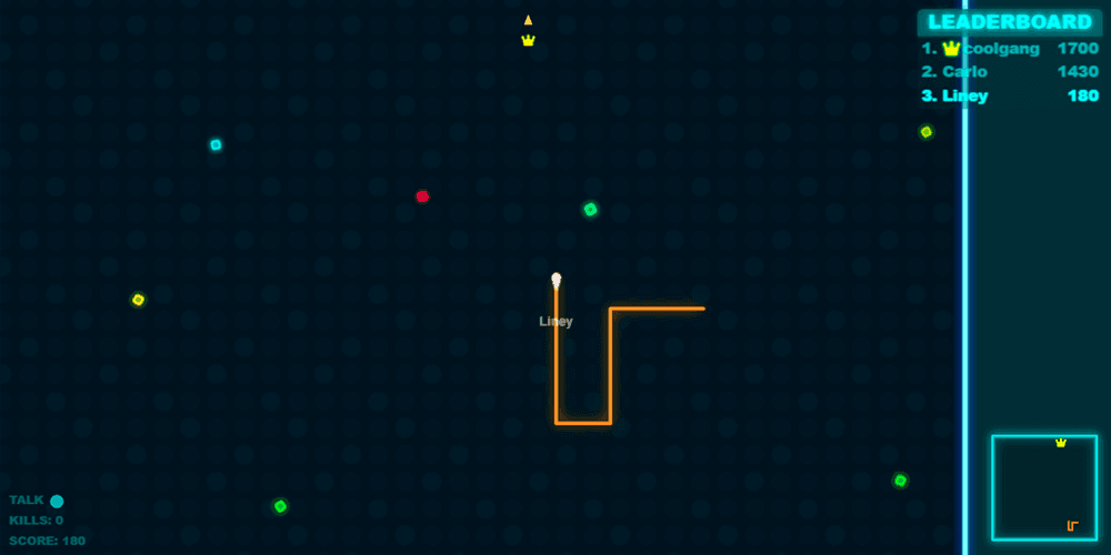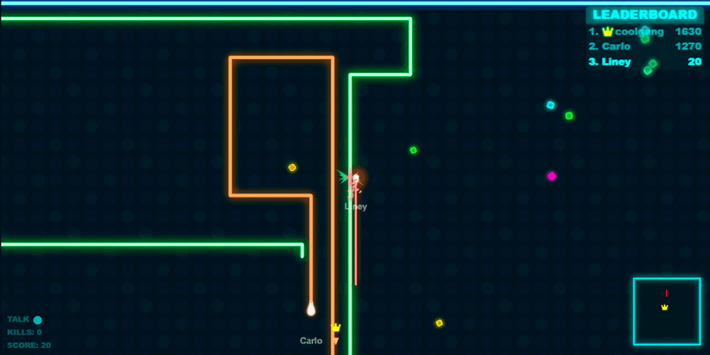 The skill curve here is deceptively steep. Beginners can survive for a while by farming energy in quieter corners of the map, staying away from congested zones and growing at a safe pace. But experienced players operate on a different level entirely. They use cutoffs, tight loops, and positional control to dominate sections of the arena. They bait opponents into committing to a direction and then slam a wall of trail across their path. The game is easy to learn in thirty seconds, but the gap between surviving and actually controlling the leaderboard is enormous, built on spacing awareness, risk management, and reading other players' intentions in real time.