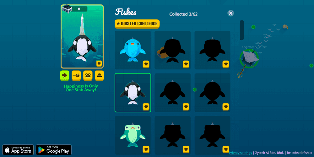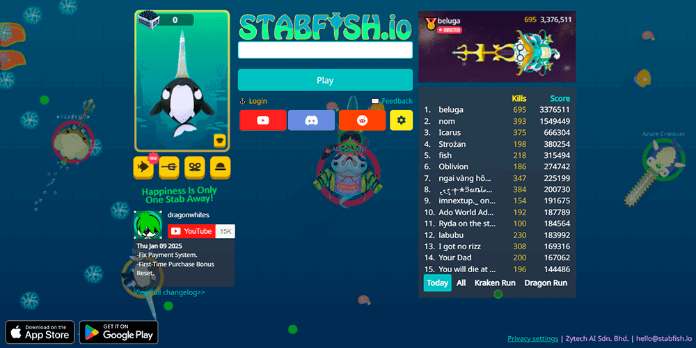 Stabfish.io drops you into an underwater battlefield with one clear objective: stab everything that moves. Developed by Zytech AI and released in February 2020, this browser-based arena game puts players in control of a sea creature armed with a lethal tusk, then sets them loose in an ocean teeming with rival predators. The appeal is instant. There is no tutorial, no lengthy onboarding, and no barrier between you and the action. You move your fish, you boost toward prey, and you ram your weapon through anything unlucky enough to show you its flank. It is aggressive, readable, and surprisingly hard to put down once the kills start stacking up. Worth noting: while some sources describe Stabfish.io as a real-time multiplayer experience, the original game is actually a single-player score-attack affair where you compete against other players' best scores rather than facing them live. Its sequel, Stabfish 2, is the one that introduces true multiplayer. That distinction matters, but it does not diminish the core experience. The arena still feels crowded, dangerous, and fast, and the competitive pressure of chasing leaderboard positions gives every run a sense of stakes.