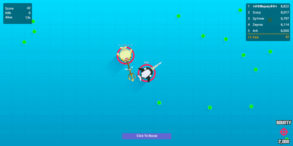 The gameplay loop is lean and effective. You guide your fish with the mouse and click to activate a speed boost, burning meter that you replenish by collecting food and meat scattered across the map. Eliminating enemies is a matter of positioning: you need to strike from the side or behind, driving your tusk into an opponent while keeping your own vulnerable body away from their weapon. Each successful kill adds length to your tusk and threads the defeated fish onto your skewer like a grim trophy, a satisfying visual confirmation that you are climbing the food chain. As your tusk grows, so does your confidence and your risk. A longer weapon gives you reach and lethality, but it also makes you a more visible and enticing target. The game leans into this risk-reward tension with systems like the bounty mechanic, which periodically marks a high-performing player as a priority target, offering bonus score to whoever takes them down. If the bounty lands on your head, the entire arena shifts from hunting ground to escape room. Chain bonuses reward players who eliminate fish sharing the same colored ring in quick succession, adding a layer of target selection that goes beyond simple proximity. The game also awards random bonuses mid-match, injecting small bursts of unpredictability into each run. These mechanics are not deep, but they are layered just enough to keep the moment-to-moment action from feeling one-note.