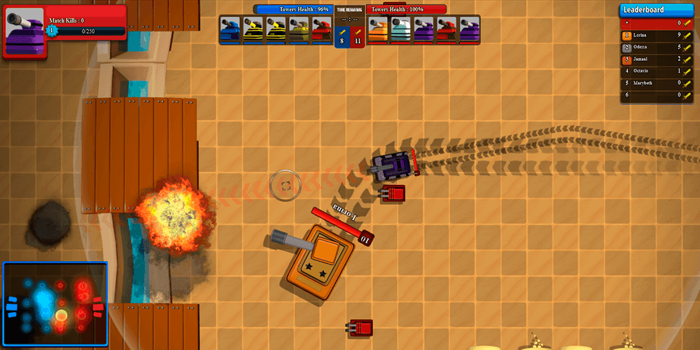 Visually, Tanko.io keeps things clean and functional. The colorful 2D art style makes the battlefield easy to read at a glance — you can always tell where teammates are, where enemies are pushing, and where power-ups have spawned. Impact effects and chunky hit feedback give every shot a satisfying punch without cluttering the screen. The UI is minimal, the load times are negligible, and the fact that everything runs in an HTML5 browser with no download means the barrier to entry is essentially zero. For a game designed around short sessions and instant gratification, the presentation does exactly what it needs to do.