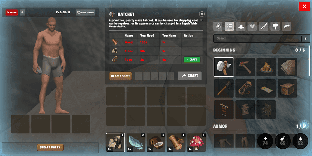 The early minutes of any life in Tribals.io follow a recognizable pattern. You scavenge the landscape for edible leaves, corn, coconuts, bananas, and berries to stave off starvation, then start gathering wood and stone to craft your first tools. A hatchet lets you harvest faster, a pickaxe opens up mining, and from there the crafting tree branches out into torches, bows, and eventually firearms like a craftable pistol. Every item you produce feeds into an experience system, so there is always a mechanical incentive to keep crafting even after your immediate needs are met. Leveling up expands your options and makes each session feel like it has forward momentum rather than aimless wandering.