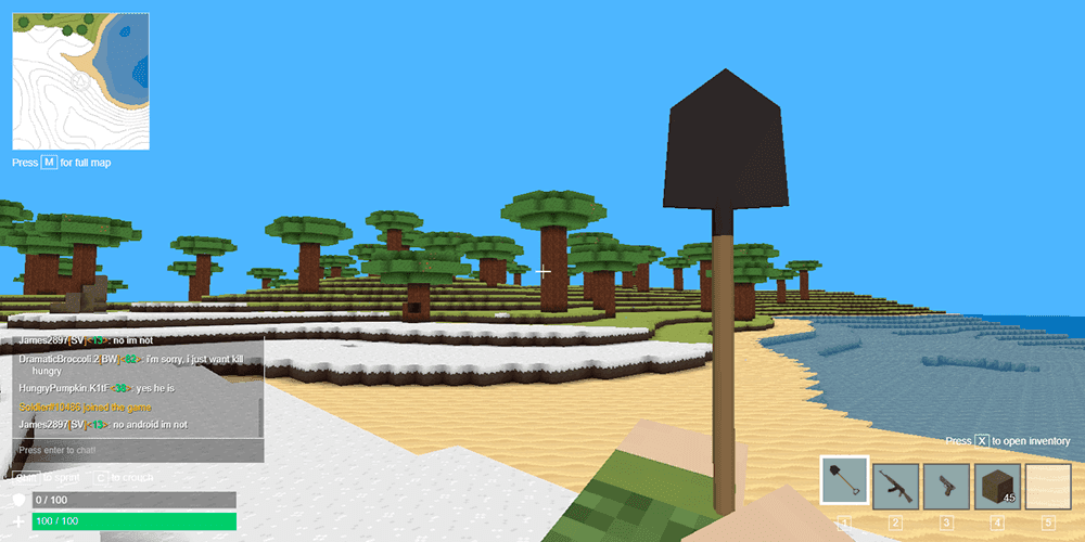 The weapon system in Voxiom.io follows a five-tier color-coded structure: Common, Uncommon, Rare, Epic, and Legendary. Higher-tier weapons deal more damage and reload faster, so upgrading gear becomes a persistent goal throughout a match. Accuracy and recoil mechanics are present, and players can aim down sights using either the right mouse button or the F key for tighter shot grouping. Inventory management adds another layer of decision-making. Each player has five ammo slots, five backpack slots, and five hotbar slots, so carrying everything is never an option. Choosing between an extra stack of ammo or a set of building blocks can determine whether you survive the next encounter.