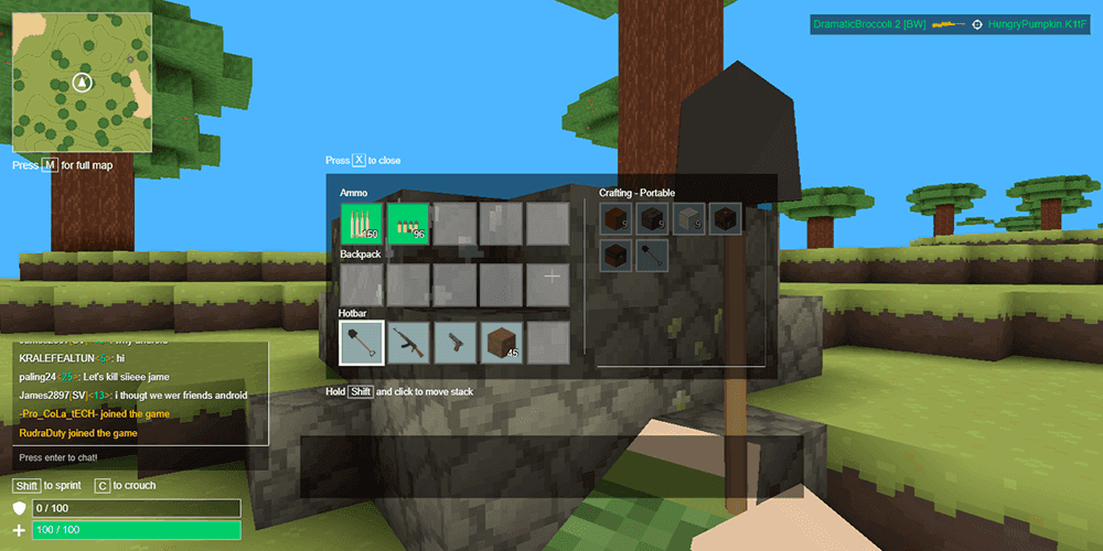 The crafting side of Voxiom.io is what truly sets it apart from other browser shooters. Players start every round with a shovel, the only tool that can harvest blocks from the environment. Different blocks have different properties: some are tougher to break, and ore blocks drop gems used in crafting recipes. Basic items can be assembled directly from the inventory screen, but upgrading weapons to higher tiers requires finding and using a workbench placed somewhere on the map. The block physics system also matters tactically. Floating blocks collapse when their supports are mined away, which means you can undermine an enemy's cover or collapse a structure on top of them.