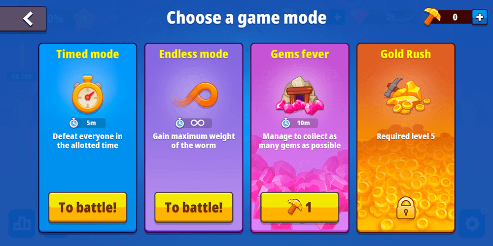 Mode variety keeps the rotation fresh. Beyond the core Timed and Endless options, Gem Fever challenges you to hoover up as many gems as possible in ten frantic minutes, while Gold Rush, unlocked at level five, shifts the objective to pure currency farming. Seasonal events tied to holidays like Halloween and Christmas introduce themed arenas, exclusive skins, and limited-time missions that create a genuine fear of missing out. Global and regional leaderboards track your best performances permanently, giving competitive players a reason to optimize their skill-tree builds and refine their trap tactics. Combined with the steady drip of new cosmetics and the low friction of browser-based play, these systems turn Worm Hunt into an arcade game with just enough metagame to keep sessions stacking up week after week.