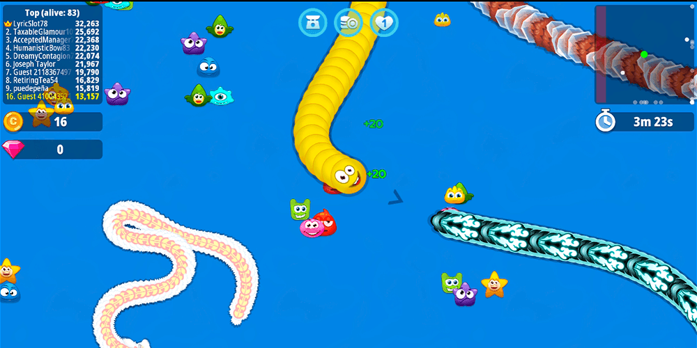 The arena itself adds pressure in different ways depending on the mode. Timed matches compress five minutes of chaos into a shrinking play area, pushing worms closer together and turning the final minute into a minefield of overlapping bodies. Endless mode strips away the clock and lets you chase a personal high score at your own pace, but crowded central zones still punish careless steering. Sudden reversals are common in both formats. A top-three worm can vanish in an instant if it boosts into a well-placed coil, scattering its mass for smaller players to scavenge. Success hinges less on raw speed and more on positioning, patience, and knowing when controlled aggression will pay off.
