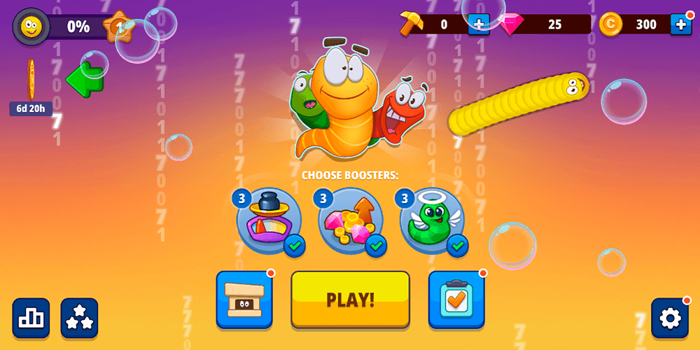 Between rounds, Worm Hunt gives you plenty of reasons to queue up again. Coins earned in matches buy new worms, each carrying a unique skill tree with permanent buffs to attributes like speed, acceleration, and magnet range. Gems arrive through daily login gifts, calendar missions that refresh every month, and special event tasks. The result is a sense of persistent growth that a basic snake clone simply cannot match. Even a thirty-second run where you crash immediately still nudges a daily quest forward or banks a handful of coins, so no session feels entirely wasted.