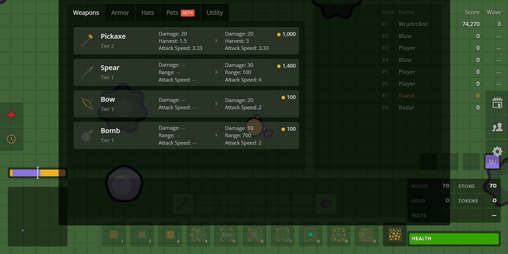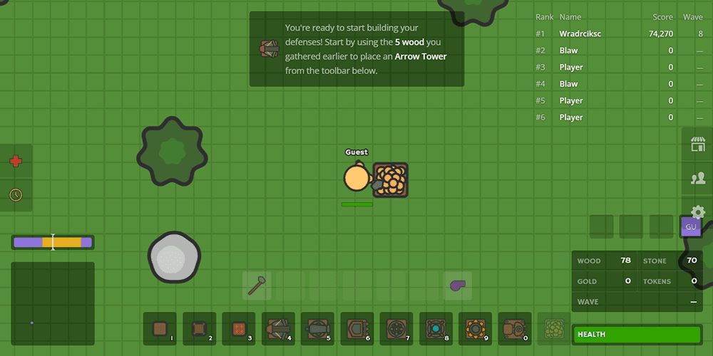 The early minutes of a run teach you that Zombs.io rewards planning over reflexes. Experienced players stockpile around five hundred to seven hundred wood and stone before they even think about placing their Gold Stash, scouting for a position near resources but away from monster camps that could complicate defense lines. Once the stash is down, the real decision-making begins. Arrow Towers offer balanced, reliable damage. Cannon Towers hit harder against single targets. Bomb Towers deliver area damage to clustered hordes, and Mage Towers add knockback that buys precious seconds for your other structures. Layering these options behind funneling walls and slow traps creates a satisfying puzzle where every tile matters. The controls stay out of the way entirely, WASD for movement, spacebar or left click to interact, number keys to select building types, so the challenge lives in the strategy rather than in fighting an interface.