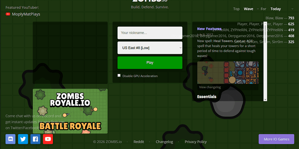 Zombs.io is one of those browser games that grabs you within the first sixty seconds and refuses to let go. Released in May 2017 by End Game Interactive, the studio behind ZombsRoyale.io and Spinz.io, it drops players into a top-down 2D world with a single pickaxe, a handful of trees, and the looming threat of nightfall. The premise is deceptively simple: gather wood and stone during the day, place a Gold Stash to anchor your base, surround it with walls and towers, and then survive the zombie waves that pour in once darkness hits. It is tower defense, resource management, and light MMO competition rolled into a package that runs in any web browser without a single download.